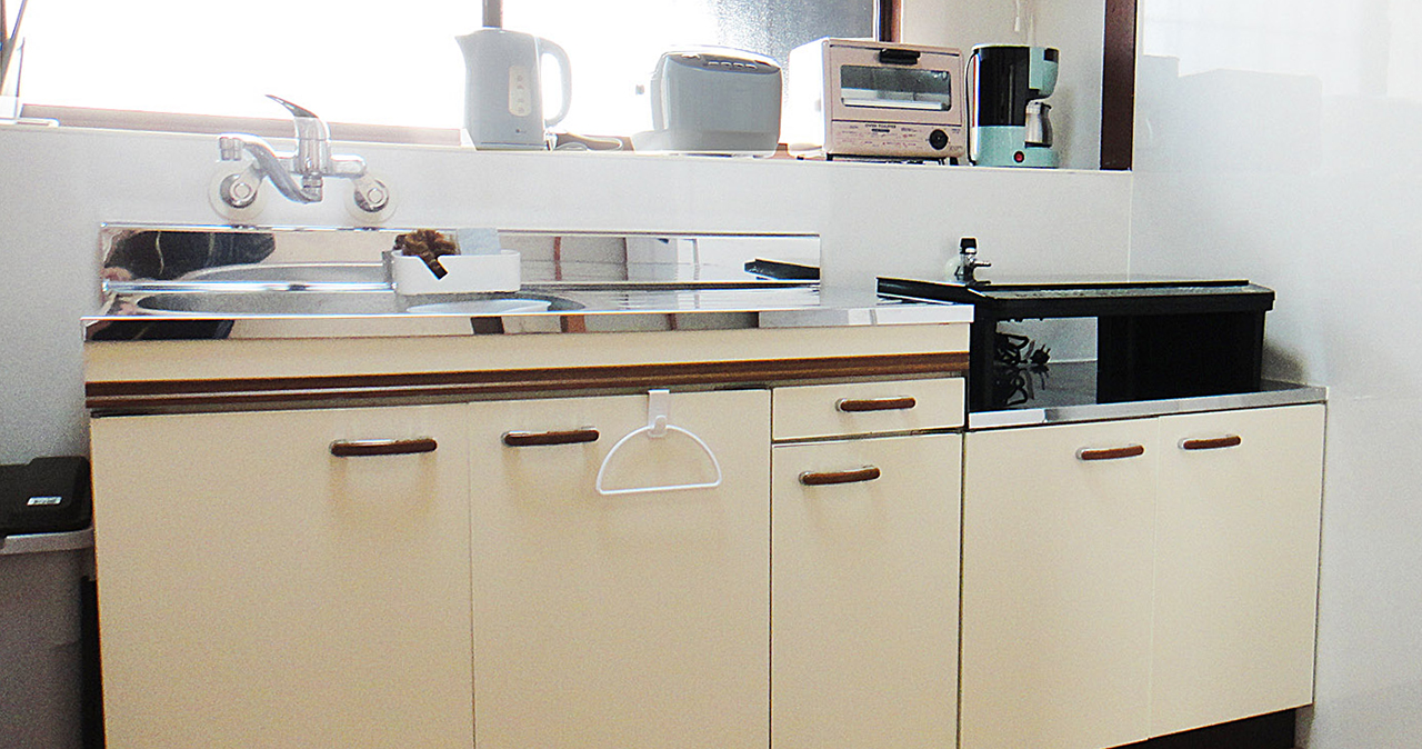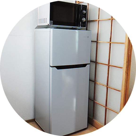 キッチンには2ドア冷蔵庫・IHコンロ・電子レンジ・炊飯器・電気ポット・鍋・フライパン・皿などもご用意していま す。