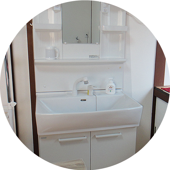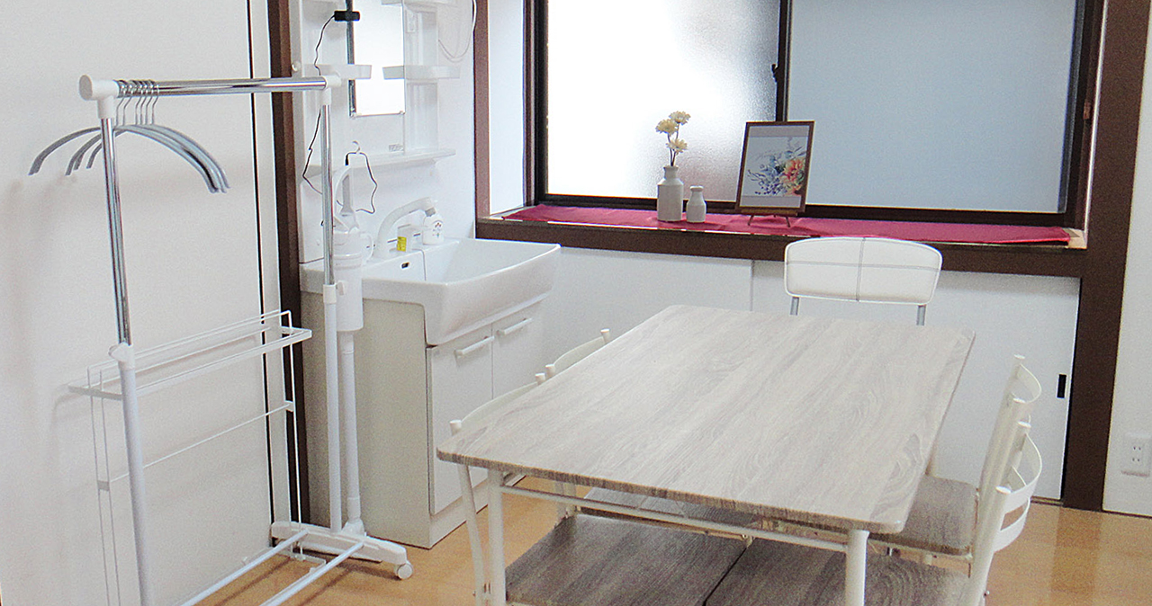 シャワー付き洗面台・テーブル・椅子5脚・ハンガーラック「