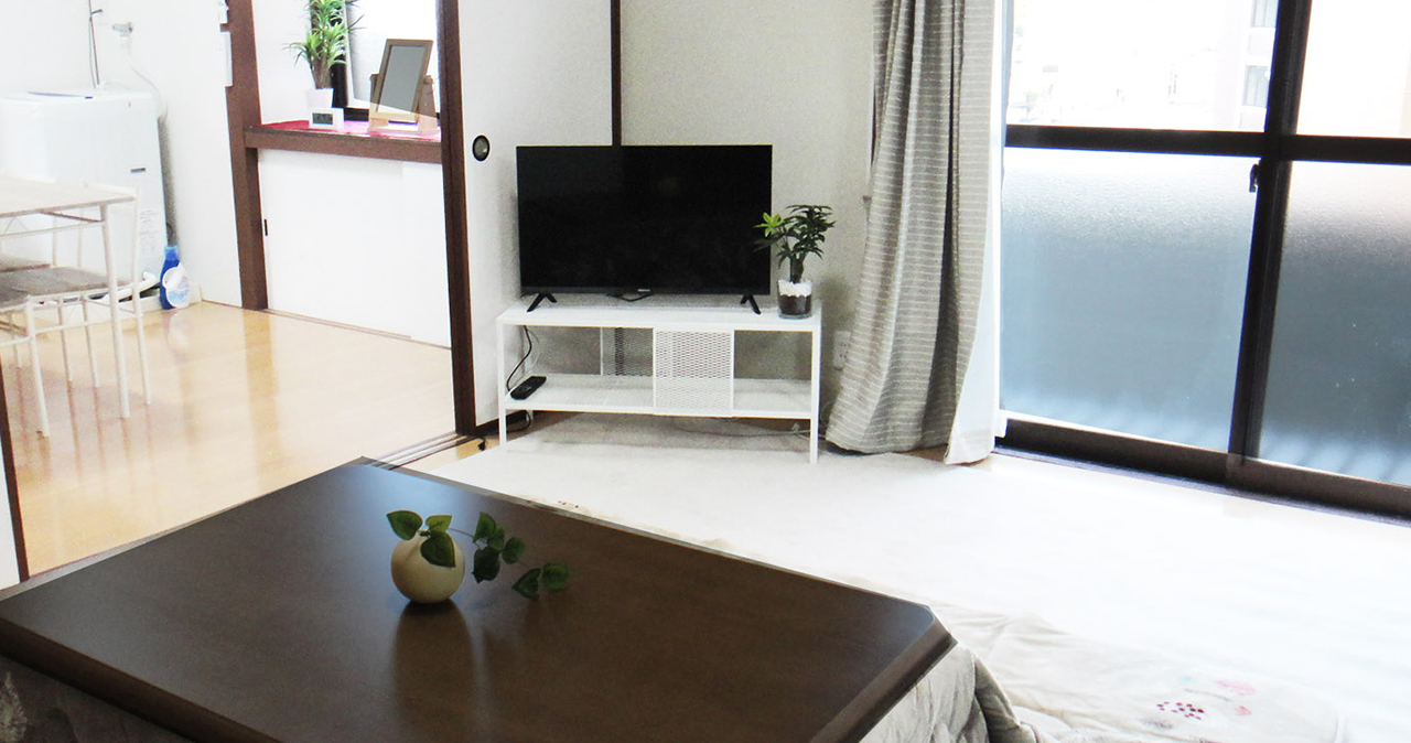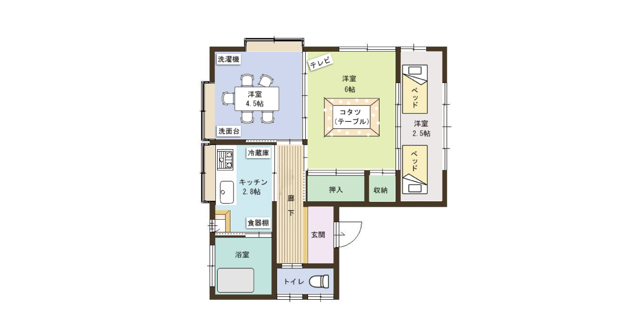 和室6帖・洋室4.5帖・ベッドルーム2.5帖(シングルベッド2台)・キッチン2.8帖・浴室・トイレ・ベッド2台と布団3組により最大 5名迄の滞在にご利用 いただけます。